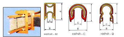 HXPnR-M、HXPnR-C、HXPnR- Ω 系列单极组合式滑触线 | 型号规格 | 滑触线截面尺寸(mm) | 载流量(A) | 适配置式集电器 | A | B | C | HXPnR-M-100 | 15.2 | 9.6 | 3.8 | 100 | MJD-100-M1、MJD100-M2 | HXPnR-C-120 | 15.8 | 14.8 | 5.4 | 120 | MJD-120-C1、MJD120-C2 | HXPnR- Ω-100 | 17.8 | 12 | 6.1 | 100 | MJD-100- Ω | 注:1、滑触线标准长度:4m。2、HXPnR-M与HXPnR-C以及HXPnR- Ω性能相同,几何形状不同。 |